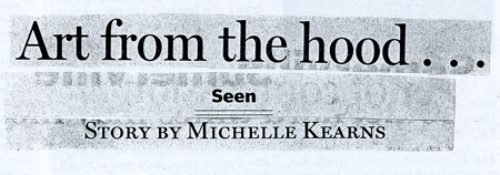 | ART FROM THE HOOD . . . FENDER, DOOR, TOO BOSTON GLOBE Sunday, July 28, 2002 Section: City Weekly, Page 11 From all the e-mails he was getting weeks ago in California, it seemed to art-car artist Harrod Blank that the party in Boston was going to be the biggest gathering of art-car people in Massachusetts history. And on the evening of July 20, car by car, the party gathered momentum. A van-size pink piggy-bank one. A matte green Toyota with boxes for chalk by the rear-view mirrors. A shiny black Saab with suction-cupped lobster eyeballs, claws, legs, and a tail. But at the start of things, a little after 6 p.m. on the clear night, the parking lot by the artists' studios in the old rum distillery on East Second Street was mostly empty. People sat talking under a tree near a keg and by tables with ginger ale, a box of cannoli, Italian sausages, and a vase of orange-yellow flowers. To liven things up, hostess and artist Alison Edwards went to her studio to get a grocery-bag sculpture she used to strap on the roof of her old art car. She had decided to throw this party in honor of Blank, the art-car guru on a low-budget tour with his new book "Art Cars: The Cars, the Artists, the Obsession, the Craft." She met Blank at an art-car event years ago, before her own cloud-covered car broke down and she moved from Chicago, where she was used to having goofy parties. Here her life has been more serious and work-focused. For the few years, she has worked for the religion and arts initiative at Harvard Divinity School. On this Saturday evening, she was giving Chicago silliness a try in South Boston. One of the first of the silly cars was the shiny black station wagon completely covered in shimmering quotations, written in small silver letters. On the passenger side: "Early to bed, early to rise makes a man healthy, but socially dead." And, "It's still not weird enough for me," on the bumper, which was not far from where the owner Pixel ("That's it. Just Pixel.") stood embracing his girlfriend, a black foxtail hanging straight down from the back waist of his jeans. As people waited for Blank to arrive from the airport, they took cans of washable spray paint that Pixel happened to have in his car and applied it to Edwards's plain blue sedan. "He's departing from my scheme," said Edwards as she looked at the red heart with an arrow that was on a door. She had been thinking of painting her car with a cosmograph, a kind of religious map of the universe that she pictured with concentric circles of animal and musical symbols. "Right now I'm working on collaborations," she said with resignation. Her friend Drew Bourn was impressed. "It's so much harder than just being a control queen, which is what I prefer," said Bourn, wearing a Men-Use-Condoms-or-Beat-It T-shirt and smiling as he held a brush and a jar of black paint. Bourn, who is working on his Ph.D. dissertation about secrets in world religions, had never thought of doing an art car. "But now that I'm here, I'm thinking it might be fun," he said. On the table behind them was a cake with pink and yellow piping, car keys stuck on the icing, and a sparkly sign with toothpick posts that said, "Art Car Extravaganza." "Oh, honey, that is really cool," Edwards said happily. "They are real keys, but I did wash them with soap and water," Tiffany York told her. "I washed them and polled two different people and said, `Is this disgusting?' " Edwards had fastened her grocery bag sculpture to the roof of a friend's canary yellow truck in the lot. This was the first time she'd put it on in Boston. In Chicago people used to laugh at her when she drove by, thinking she was dumb for driving off without putting her groceries away. She wondered if here people would be more earnest, chasing after her with worried looks. Soon she would have to do a test. Her friend Amelia Perkins, who hasn't owned a car since she was 16 ("That's pathetic," she said) had gone several times to Houston with Edwards for that city's annual art-car parade, the biggest in the country. Most art-car parties are in parking lots. "Because obviously you have to go to a party with your car," Perkins said. She was expecting interesting things to happen this evening. "Most of the art-car guys are very cute," she said with a laugh. Blank was one of them. Tall, tanned, with a black blazer and black cowboy hat, he arrived and climbed out of a nondescript car. The friend who drove him, Howard Davis of Avon, used something ordinary instead of the VW bug he had turned into a big red push-button phone car, fearing airport security might not let him through. As the two men lingered by the edge of the lot, a long white sedan covered with small plastic people rolled in blasting Bob Marley singing, "Sing the song of freedom . . . " Bubbles floated out from a box on the trunk and Blank looked on thoughtfully. "Something's going on here. I can feel it," he said. Next came the pink piggy-bank van with "Pentagon $396 billion" written on the side. A green Toyota 1987 FX hatchback that followed was a favorite, partly because of the surprise ("It's a chalkboard. Ahh."), partly because there was chalk for everybody. Bourn drew a labyrinth on the hood and then wrote in arcs and lines in his own Tolkien-inspired language. "Can you believe it?" said Edwards, who wrote, "It has a certain je ne sais quoi, but I don't know what it is." Her own car was getting more and more decorated, too. A woman in orange pants with little round mirrors edged the heart in white spray paint. "It was definitely fun. I would do it again," she said. "I've never been to a party where I could paint a car." Sometime around 9 p.m., Blank spread out his books and movie videos on a table, but he sold only one. People were too busy meeting each other, he figured. Blank's friend, on page 82, who had made his car, Duke, into a skull-and-travel-trunk tribute to Hunter S. Thompson, had driven down from Maine. "I just follow Harrod around the country," said