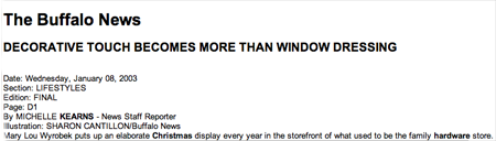 | DECORATIVE TOUCH BECOMES MORE THAN WINDOW DRESSING Buffalo News Wednesday, January 08, 2003 Section: LIFESTYLES Page: D1 The day after Thanksgiving, Mary Lou Wyrobek got 10 boxes from their places in the closet and the basement, went into the vast room that was once her Aunt Mary's hardware store and reached into one of the old display windows to spread the white satiny cloth. Wyrobek begins by arranging the wintry scene - an electric sledding hill with plastic sledders that can race for hours and an old white church her Aunt Mary used to use. These pieces go in the window closest to the counter with the cash register that still holds the pennies left behind years after her aunt broke her hip and customers stopped coming. It was 1986 or so when her mother finally closed the family store her grandfather founded in 1922 at 491 Amherst St.For almost 20 years, the glass panes haven't shown off new hinges, keys and locks and the building has been just a house, not a store. For all that time, Wyrobek has been putting a winter village in one window and angels and a creche in another, just as her aunt did for the 30 years she ran the store. "It would be odd not to," Wyrobek said. "We had everything. What was I supposed to do with it?" This is the way Wyrobek keeps alive a tradition that is her tribute to the once-prosperous Polish street and to the 21st-century life she intends to keep in a neighborhood that has grown poorer without its old shopkeepers. Since the late 1950s when the department stores downtown were known for their elaborate windows and Wyrobek was about 5 years old, her aunt set up holiday scenes, leaving a few saws hanging in the background until the village grew and the houses and trees and sleighs took over. Now Wyrobek unwraps the tissue paper and spends seven hours on each window, arranging skaters, streetlights, shops, a caroling couple with a caroling dog, paper snow men and Santa and presents. In the second window, the one closer to the Assumption Church the next block up, there are religious things. Angels surround a Nativity set inside a ceramic holder shaped like the onion-like turrets that top Russian Orthodox churches. While her aunt had been particular about the dates, putting the scenes up after Dec. 8, the Feast of the Assumption, and taking them down after Jan. 6, the Feast of Three Kings, Wyrobek lets the Christmas trees, Santa and the creches stay until the middle of January when the Martin Luther King Day holiday gives her the time off she needs to put it all away. On this block, between Bush and Howell streets in the Black Rock neighborhood, most everything has changed since the decorating began. There's not a plumber next door anymore. The drapery store has been replaced by a parking lot. The gas station is abandoned and unpainted, not meticulous and clean the way the owners used to keep it. When the children of the elderly bakers didn't want to run the Kowalkowski Bakery, it closed and the chocolate coconut cake and the paczki jelly doughnuts disappeared. "People had cars. They could go wherever they wanted," said Wyrobek, who is now 45 and teaches religion at Our Lady of Black Rock School. She didn't move to the suburbs with all the other people who left the neighborhood because she likes being just five minutes away from a big grocery store and the highway. It would be hard to find a new house with maple floors and wreath designs pressed into the high ceilings as they are in this old house, she said. Even though fewer people are around to see her place at night, Wyrobek thinks her windows are at their prettiest after she comes home from work and goes inside the old hardware store, which she has turned into a kind of living room with lamps and recliners and a Christmas tree on the long counter. She flips the switches from behind the windows and a blue spotlight bathes the creche and the angels in dresses of pink, blue and white feathers. At the village, the white church glows, red and green lights appear at the tips of the birch tree branches, the Christmas tree turns blue and pink, the four small skaters spin and twirl on a plastic pond and Santa sits by the fire in a room her brother made from a cardboard box and contact paper. She likes to see the decorations welcome her when she comes home and she is glad for these pieces so carefully saved by the old hardware generation. But panels block her view from the inside, so on some cold nights she goes out to look at the angels and the village and its center with "Joe's Golf Shop," for her golf-loving father, "CANDY," for her mother and the sweets she liked, and the tiny doorway with "Mroszczak Hardware," the way the sign above her aunt's store used to be. |