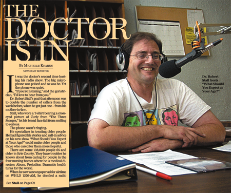 | THE DOCTOR IS IN A Buffalo geriatrician has taken to the airwaves to expand his grass-roots effort to improve the quality of life for the aging population BUFFALO NEWS Tuesday, July 20, 2004 Section: LIFESTYLES Page: C1 It was the doctor's second time hosting his radio show. The big microphone was poised and so was he. Yet the phone was quiet. "If you're listening," said the geriatrician, "I'd love to hear from you. "Dr. Robert Stall's goal that afternoon was to double the number of callers from the week before, when he got just one -- from his mother-in-law. Stall, who wore a T-shirt bearing a cross-eyed picture of Curly from "The Three Stooges," let his broad face fall from smiling to serious. The phone wasn't ringing. He specializes in treating older people. He had figured his stories and call-in advice on his new show "What Should You Expect at Your Age?" could make older people and those who cared for them more hopeful. There are some 138,000 people 65 and older in Erie County. They have troubles he knows about from caring for people in the four nursing homes where he is medical director: Abuse. Prejudice. Dramatic health turns for the worse. When he saw a newspaper ad for airtime on WHLD 1270-AM, he decided a radio show just might work. Already on the air that particular afternoon, he'd told his joke about how his patients are the biggest carriers of "AIDS." Hearing aids. Walking aids. And he'd played his recorded stories. The woman in her 90s playing songs on bells. Local actor and director Saul Elkin read Shakespeare's seven ages of man poem. Stall's 10-year-old daughter talked about what she loved about her grandparents -- going to the beauty shop, home-cooked chicken, trips to Florida. He gave the number again -- 855-6848. Still, nothing. Stall, 47, who is also an assistant professor of medicine at the University at Buffalo, has tried not to get too discouraged as he gets started. He is an optimist about this crowd. He doesn't like to say "old," because it's too negative. He wants to make people feel healthier and less neglected as they get older. He knows doctors sometimes don't have time for long conversations to figure out what's wrong with patients of any age. He can't take on many more himself, so he has developed a solution he's calling grass-roots geriatrics. He wants his effort, which includes his broadcasts, to show people that they shouldn't expect to feel bad just because they're old. "There is always something that can help!" Stall wrote in an announcement. Twice he has worked with Lions Club members and other health care workers to organize health fairs in senior housing units. Since doctors have so little time, Stall has people identify problems using an assessment form he developed. It asks older people and their caregivers about chronic pain, dark moods, incontinence, night waking for bathroom trips. A doctor can then look at the answers and tackle the problems. Radio, Stall thought, would be another way to get the word out. Some troubles are so easily fixed, such as people taking too much of too many different kinds of medicine. One over-the-counter pain reliever and sleeping aid makes patients anxious and psychotic. A friend's brother was so depressed -- until Stall advised he stop the pills -- that the friend was afraid to let his brother return home to Florida. During Stall's residency at Veterans Affairs Medical Center, a frail, thin man in his 90s arrived unconscious and was thought to have dementia. Stall found pneumonia, which was improved with an IV and antibiotics. Not long after, the man went home and gardened. Another time, Stall gave a nursing home checkup to a woman who had not spoken in a year. He removed an inch-thick earwax plug from each ear. She replied softly, "I'm OK," when he asked how she was. "To be totally isolated by deafness because of earwax was a shame," Stall said. He is lenient about diets. A nursing home resident thrives on takeout fried chicken for dinner every night, and Stall approves. "It makes him happy," he said. Geriatricians, he said, are trained to be most interested in getting people to enjoy life and ease pain. Definitively curing disease is not a priority. "Truthfully," he said, "I don't think geriatrics should be a specialty. I'd love to be put out of business, but I don't think it's going to happen." Fewer and fewer doctors choose it as a specialty: Certification records show a drop from 1,254 in 1991 to about 200 or 300 between 1995 and 2001. Stall, who is among 40 or so local geriatricians, was drawn to it because he had been lucky with his grandparents. All four of his grandparents were alive for most of his life. "It's hard to believe they're not here to talk to and hug," he said. As the second half of the show -- the call-in half -- came to a close in the small WHLD studio on Delaware Avenue, Stall was tired. He'd been up until 3 in the morning editing his interviews. "The call lines are open. Come on. Let's get on the phone here," he said. "Now, I don't hear any phone calls yet." The phone rang. Wonderful. A woman wanted the definition of a term that describes a precancerous condition of the esophagus. And that was it. Just one call -- from his wife's cousin. For the next 15 minutes, Stall tried to explain how his self-assessment test worked by reading aloud from its questions. "What is the one thing that you do that you enjoy the most?" "What bothers you the most?" Stall wondered if he was doing the right thing on the radio. Pop psychologist doctors had shows, so why not someone for older folks? His parents thought he should be syndicated already. But was anybody else out there interested? Was anyone listening? He could easily think of a year's worth of programming. He'd like to interview Walter Gretzky. He knows the father of Canadian hockey star Wayne Gretzky just had a stroke. He wants to talk to a classics professor about Cicero's writings about aging. He intends to play the Beatles' song "Help!" for a s