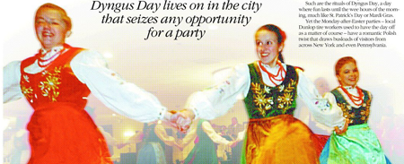 | DYNGUS DAY LIVES ON IN BUFFALO, WHICH SEIZES ANY OPPORTUNITY FOR A PARTY Buffalo News Friday, April 9, 2004 Section: GUSTO Page: G22 Grown men squirt water at women with toy guns. And it's fine to flirt by tapping the one you fancy with the tip of a pussy willow branch. Showing open affection for polka music is also cool. So is dancing to it. Such are the rituals of Dyngus Day, a day where fun lasts until the wee hours of the morning, much like St. Patrick's Day or Mardi Gras. Yet the Monday-after-Easter parties -- local Dunlop tire workers used to have the day off as a matter of course -- have a romantic Polish twist that draws busloads of visitors from across New York and even Pennsylvania. "It's so absurd, you can't help but love it," said Hadley Pawlak, a 26-year-old public relations account manager who grew up on the East Side, where the local Dyngus Day tradition is said to have started at an old Polish singing club 43 years ago. Her favorite stop on the Dyngus Day circuit remains the century-old Adam Mickiewicz Library and Dramatic Circle on Fillmore Avenue with its Polish beer-stocked bar. The end-of-Lent celebrating usually involves beer drinking, kielbasa eating, live polka bands and dancing with abandon. "The day held so much promise: Who's going to be out? Who's going to be squirting you? And who's going to be whipped with pussy willows? Everybody's guard's just down and it's just fun," said Evelyn Sliwa, 30, who also grew up in the once-predominantly Polish East Side. "It's the whole introduction to spring and the dating season and everyone's feeling frisky," said Sliwa. She, too, goes back to her roots and celebrate at the Mickiewicz club, which she calls Mickey's. "It's not a drink fest," she said. "It's truly an afternoon to evening of merriment."