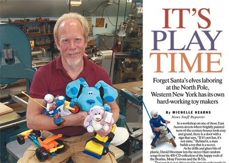 | IT'S PLAY TIME Forget Santa's elves laboring at the North Pole, Western New York has its own hard-working toy maker Buffalo News Sunday, December 28, 2003 Section: LIFESTYLES Page: E1 In a workshop on one of those East Aurora streets where brightly painted turn-of-the-century houses look cozy and grand, there is a door with a sign that says, "If it's not fun, it's not mine." Behind it, a man builds a toy that is a secret. As he drills and glues bits of plastic, David Moomaw lets the stereo blast random songs from his 400-CD collection of the happy rock of the Beatles, Moxy Fruvous and the B-52s.That way he's not distracted by repeats as he works in the old hayloft he converted to a workshop. Above him on the slanted ceiling he tacked wood signs he carved for inspiration: "Do one thing at a time. Do it very well. Then go on to the next." "Do it now before you forget." "It's all a matter of will." All of this lets the 52-year-old man with a goatee and the tanned, blond, muscled look of a Beach Boy stay focused so he can work relaxed and quickly enough to meet deadlines. It is one of his secrets to making a living as a freelance toy designer -- one of about 30 freelance toy people who used to work at Fisher-Price, famous for its little people and wooden pull toys. A former principal designer for the toy company he still loves, Moomaw now prefers to work on his own, without meetings or bosses. "I don't want to be in charge," he said. "I want to make toys." It was nearly lunchtime and he'd been up since 3:30 a.m., the beginning of his usual 10-hours-a-day schedule that lets him finish in time for dinner with his wife and son. His gaze stayed on the plastic bits on the worktable he made out of an old bowling lane. He gave his gizmo a test by pulling its little white plastic trigger. A foam disc flew out. That was good. But the rest of the foam ammunition in the chamber was sticking. That was a problem. He had only the afternoon to make the secret toy fire smoothly, one foam disc after another. He knows toys must be protected from copycats during their two-year trip to store shelves. Many of the toys and mechanisms Moomaw designs eventually do finish that journey, becoming lawn mowers that delight him by shooting out bubbles instead of grass; blue dogs with ears that move when kissed on the nose; and, a favorite, a remote-control motorcyclist who can go backward, turn his head, put his foot down to brake and chase the cat. Fooling around to make toys work remains one of his life's pleasures, even if the toys fail to sell. Many have flopped, even after hours upon hours of designing and tinkering and imagining the children who will slide in the snow on the knee skis, or push the buttons to make a small plastic cat dance, or laugh as water sprays when they shoot his rocket into the air. "I'm a boy," he said with a smile. "I like rockets and things that go up in the air and splash." Today his project was a design problem from a toy company, not one of his creations. To get the foam bits to fire one after another from the chamber, he waxed the inside. Then, a trigger snap, and one foam disc flew into the tool drawer and another slammed into a Kleenex box. Success. Moomaw nodded, pleased. "The wax works," he said. He would specify a more slippery kind of plastic for the finished product. The problem toy came to him, as many do, because he has a reputation for knowing how to make toys work. Now, after 30 years in the business, the last 12 working for himself, he remembers his inventing beginnings, rigging one of his first toys as a boy. He was sick and his mother told him he had to stay in bed, so he added strings and tape to a toy airplane to make it fly, like a puppet, from his place on the covers.