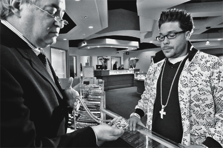 | Area jeweler cultivates business of athletes, rap musicians Basketball player bought a pendant with 42 carats in diamonds Buffalo News Monday, May 8, 2006 Section: Business Page: B7 In the 32 years since he opened his first store at a mall jewelry kiosk, Brian Levine has counted on ring orders from wedding-bound customers, but more and more he takes custom requests for glittering crosses and other "bling" from people such as the tall man in baggy jeans who hung by the counter on a recent afternoon. While the man declined to discuss his purchase, he was a professional basketball player for a team in Europe, and stood about 6 feet 10 inches. He had come in to Levine's new Brian Michael's shop on Niagara Falls Boulevard in the Town of Tonawanda for a $32,000 cross pendant with 42 carats in diamonds, adjusted to the right length for his lanky frame. The basketball player is among a growing number of men buying jewelry and, as an emissary from the glamorous athletic world, his tastes are the ones that industry analysts say make their way down to the buying public.Levine is wise to cater to such trend setters, said Amanda Gizzi of the New York City based Jewelry Information Center. "He's above the cusp of that market," she said. Levine, who sells sparkling items of all kinds and all prices, has cultivated the business of a group of professional athletes and rap musicians, in and out of town, by word of mouth and by customizing pieces so they look unique. He and the firm's staff add newly fashionable colored diamonds in purple, blue, black and yellow, to pendants. They fashion the gold front teeth coverings called "grills" and sculpt pendant nicknames written in thick diamond-studded gold script. "We handle diversity," said Levine. The basketball player came because his sister, also a customer, said she heard Levine would take care of him. "I said, 'Absolutely,' " Levine said, after the man placed an order for a cross with alternating canary and white diamonds. "So when we make that piece for him, we're going to make it like it was meant for him." Levine has made his way to these glamorous clients by making out-of-the-ordinary custom orders that once included an unusual bracelet of three intertwining gold strands for funk star Rick James. When James, now deceased, was big in the 1970s, Levine owned the jewelry counters in the now-defunct Sample department stores. Levine went on to own three stores in area malls, before keeping one shop open at a Town of Wheatfield mall and consolidating the others in his new 7,900-square-foot place a year and a half ago. "I think what happened is a few people took a chance with us," Levine said. "They're telling their associates and we're getting business." According to Gizzi, doing custom orders and catering to flashy tastes that come with an interest in urban street fashion, is how jewelers can keep their edge. Diamond-loving hip hop entrepreneur Sean "P. Diddy" Combs is among those celebrities credited for a trend that started with rapper glitz and took off with regular folks about three years ago: Men buying jewelry for themselves. "David Beckham has a diamond in his ear that most women would long for," said Gizzi, of the British soccer star. Such flashy celebrity style, from athletes and musicians, filters down, she said. "It helped explode the men's market," Gizzi said of hip hop. "It has trickled down to dads on soccer fields." On the afternoon when the basketball player roamed the store, the Brian Michael's shop had about six men who were in looking at the watch counter. Some looked young with baggy jeans and baseball caps. Others were a bit older in button down shirts. To cater to male tastes, Levine sells diamond watches, titanium rings with Buffalo Bills insignias, and long diamond-studded chains. "We've nurtured it because it's sort of happened on its own. We're sort of filling the void," he said. "I don't remember ever selling the amount of diamond earrings for men that we have currently." A custom shop in China helps keep prices of some of the more intricate diamond crosses as low as $1,500. His own staff of three jewelers also works with clients to tailor orders. Their latest project: Finding a way to use dental molds to make 14 karat gold grills fit more exactly. He has 11 people on the waiting list for the teeth jewelry that can cost from $350 to $6,000 or more with diamonds. The glittering jewels worn by those used to being in front of crowds and cameras is part of what Levine knows people of all kinds want from gold and diamonds -- jewelry that is an extension of themselves. "Aren't we all that way?" said Levine, before an employee went inside the walk-in safe and fetched some recent orders for those with a well-developed flashy side. A bracelet with 48 carats in small diamonds dusted within linked Ks: $60,000. A gold pendant with a nickname Levine preferred not to disclose studded with white and golden canary-yellow diamonds: $9,500. "They wanted it thick, they wanted it heavy, they wanted it flamboyant," he said. "They want what they are . . . That's their identifying mark." One of Levine's local clients who is in the hip hop trade explains why he spends thousands at Levine's shop. "He'll have an eye for what he'll put on me even before I get there," said David DiCioccio, who is on the grill waiting list. Sometimes, for a DVD, or promotional CD mix, Levine will lend DiCioccio pricey jewelry. An $18,000 diamond cross made an appearance on an insert for a CD DiCioccio mixed with material from chart-hitting rappers such as Juelz Santana and the Diplomats. In return, DiCioccio added Levine's shop and phone number near the song listing. Such promotion has helped spread the word about Levine who says he now has hip-hop clients who order from him in New York City. On one afternoon at Levine's shop, DiCioccio wore some of his own glittering collection of white gold and diamonds. In his ears were a pair of square earrings filled with yellow diamon