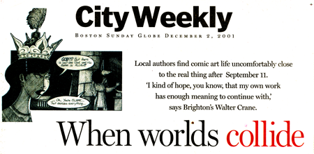 | WHEN WORLDS COLLIDE BOSTON GLOBE Sunday, December 2, 2001 Section: City Weekly, Page 1 In the wee hours before the Sept. 11 attacks stopped Walter Crane from working on his new comic book, he had been typing in his third-floor bedroom studio, hunched beneath his wall poster of ancient Rome, caught up in the adventures of his heroine, Sheba, a mummified cat on a quest to get into Egyptian heaven. For his 10th-annniversary issue, Crane was writing a scene in which his Islamic character, a female creature named Buraq, walks in to a palace. Someone makes a chauvinistic remark, and then - BAMMO! - she'd have a swordfight. When Crane had typed enough, he tried to sleep, but couldn't. A neighbor's burglar alarm kept going off, and when he finally got up and headed next door to get the noise to stop, his housemate told him to look at the news. After that, his grouchiness, the alarm, and Sheba didn't matter. "It pretty much destroyed my concentration on anything," said Crane, 30, who has been drawing Sheba since art school in 1992 and hoping that its fans would grow beyond the 1,000 or so regular readers. But now, with disaster and tragedy filling the airwaves, Sheba seemed irrelevant. What was the point, Crane and other local comic artists thought, of stories about superheroes and villains, and in Crane's case, the life of an undead cat? Even worse for him, would his religious satire, such as Egyptian and Roman gods drinking in the Bacchus bar complaining of the new popularity of Mohammed and Jesus H. Christ, seem over the line now? "I mean I sort of find myself wondering, `Oooh you know, is it even good for me to depict, you know, Muslims as being militant or something?"' he said. He thought of packing up his cats and leaving Brighton. He imagined the collapse of the entire comic book business. He eventually decided it would be better to spend time in the 'burbs with his family than to waste time drawing in his house off Beacon Street. He cleared his father's collection of Volkswagens off the lawn. He helped his sister move. He rebuilt the carburetor on his 1972 Saab. A month and a half passed before he put on a hieroglyph shirt and took his books to a table at a comic book convention. At the late October gathering at the Hynes Convention Center, he joined artists who had their own Sept. 11 dilemmas. Past the old comic book dealers, the life-size comic book weapon booth, and the stuffed Pokemon creatures on sale from a box for $1 each, the artists sat at tables signing autographs, selling comics, and talking. Were comics too silly in these times? A few tables over from Crane, Andy Fish, of Worcester, said he had decided to suspend his e-mail strip. Adam Bomb, a big cutout of which was standing behind Fish, had been doing battle with villains who were knocking down buildings in Megalopolis. After the real-life attacks in New York, Fish and his co-author, Tony Antetomaso, thought the episode was in bad taste. "When it happened, we kind of looked at it and said, `You know, two fat guys doing a comic strip, you know we should be doing something a little more worthwhile,"' Fish said. But some of his 1,000 subscribers, grade school kids mostly, wrote to say they wanted Bomb to come back and fight the Taliban. And so he took on the Sand Worms from Mars, a Taliban offshoot. "We decided to do whatever we can to provide a little chuckle in everybody's e-mail everyday," Fish said. Mike Brennan, the Arlington creator of Electric Girl, the story of an electrically charged teenager who can switch TV channels without a remote, thought he should work in references to the attack. But catastrophe seemed too big for his comic book. How could he get it in the story so that it was just right? "It's still so raw to me. I didn't want to rush and do something that I might not like," he said, from beside a row of yellow Blammo dogs, the stuffed editions of his heroine's pet. Brian Anderson, of Holden, who was sitting by a 7-foot cardboard version of his werewolf - long pointy ears, hair to his waist, a trenchcoat, a knife strapped to his calf - had no plans to change Bloodkin. The story of the younger werewolf generation clashing with the older generation, set to come out next year, will have a place in post-attack America, he said. "People are going to need escapism. They're going to need the fantasy, the dark fantasy," he said. "It's like going to an amusement park. It just refreshes you in a weird way." From behind the table where a stuffed cat wrapped in strips of cloth perched above the books, Crane thought about Sheba. "I kind of hope, you know, that my own work has enough meaning to continue with," he said. The cat's religious adventures didn't seem as trivial as Pokemon or the incessant superhero battles. But what if people took the stories too seriously? The jealous Egyptian mummy god does yell "Death to Islam!" on one page. "I believe if Muslim fundamentalists saw my book, they might put a fatwa on my head," he said, referring to a death edict. "It's a funny way of looking at religions interacting with each other and not having one religion say that they're right, which as far as I'm concerned is why we actually have these kind of problems in the first place." Lately he has been getting library books with Napoleon-era costumes and copies of drawings artists made of Egypt when Napoleon arrived. On the radio he heard a story about how the Koran doesn't insist that women wear burkas. Maybe he should have his Islamic character mention this. Buraq, whom he discovered in another Time-Life book, has a mule's body, a peacock's tail, and a woman's face, and is said to have transported Mohammed. In the last few weeks with the retreat of the Taliban, Crane is starting to feel more hopeful. Life seems normal again. Nothing bad happened in Boston. The comic distributors are still printing. He has decided he can't help himself. As silly as a mummy cat might be, this life of a comic book artist, the free time exchanged fo