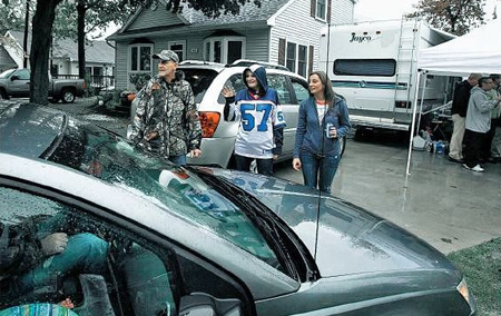 | Testing a Timeless Tradition Gathering Story Series BUFFALO NEWS Monday, October 11, 2010 Section: Local Page: D1 On Buffalo Bills home game Sunday mornings, Kim Steger usually starts hearing the music thumping and the hooting and hollering — "Go Bills!"—when she's still in bed. She rolls over, rubs the sleep from her eyes and says to herself, "Oh, my God. These people are crazy. They're here already!" Just beyond her bedroom windows lies parking Lot 1, its 871 spaces stretching toward the main entrance to Ralph Wilson Stadium and its 73,079 seats. For some reason, on the cold, rainy Sunday before the New York Jets game, the fans who started setting up grills and rain canopies as soon as the lot opened at 8 a.m. seemed quiet. Maybe it was the weather. Or the disappointing, and usual, string of losses. After a decade of failing to make the playoffs, Steger can't help but think of giving up on her home game parties and the Bills. She longs for the golden years of the 1990s. Back then, with more wins, more Mondays felt good. People talked football more, ate out more and bought more cars from the dealer she once worked for. Now, on some of the home game mornings each season, Steger wakes up and thinks, "I don't want to do this." Thin, wiry, with streaks of blond in her brown bob, Steger has a wry impatience and a kind, maternal approach. When her preparations began Saturday, she couldn't help but threaten what she might do if her team lost. "If they're not winning, I'm in the house," she said before driving off to buy supplies for the tailgate party she and her husband, Paul, have made a habit of throwing for family, friends and strangers inside their finished garage. It is part of their routine of parking cars for $15 on the yard of the neat cape they've lived in for 23 years. The old team is still beloved in the modest, squared ranches and two-story houses on the streets of Oakwood, Allen, Glen, Fay and the Stegers' Pilger Place, off Abbott Road in Orchard Park. People in this neighborhood, where the fieldhouse looms over back fences, bask in the game's hullabaloo, make cheerful accommodations and seize its opportunities from a muted, comfortable distance. One woman planted hostas to keep cars off her lawn. Others rent port-a-potties so people won't use the grass for that. From temporary offices in open garages, people rent lawn space for $10, fitting in 10 or 20 cars or more. A bargain compared with the bigger, pricier $25 lots with condensed tailgating madness. As Sunday morning's parties began before the Jets game, two young women in red and blue leggings, rain boots and Bills jerseys walked by the mums and pumpkins Steger arranged on her front steps. They giggled as they carried cases of beer to friends in the big lot beyond, where rain canopy shelters dotted the wet asphalt. Bills flags flew in the chilly breeze. Tables, a few with football-field patterns, were spread with bags of cheese puffs, shrimp and cake. Meat sizzled on a grill perched on a red, white and blue patio built on top of a van. Men played a drinking game, trying to hold beer "poles" of taped-together, empty cans beneath a full one. By 10 a.m., when two motor homes were already in Steger's drive—she marveled when 25 people once clambered out of one—someone wanted her husband to start organizing the parking. "Tell the boss he's got a line. There's cars all over." Maggie Wilson and her husband were settled in the Stegers' front yard, as cars parked in the grass around them. When the team is bad, she said, these mornings matter more. The fun they could control was in the bottles of hot sauce, dill and bloody mary seasonings that lined the rim of the open car trunk. Inside it, a small TV, plugged by extension cord into the Stegers' outlet, showed a golf tournament. A propane heater's blasts warmed visiting friends who just came for drinks and conversation at their cocktail table. "We haven't been to a game in four or five years," one smiled. People collecting on the lawn, on the driveway, and in the house and garage included a Long Island visitor, keeping quiet about his Jets allegiance. This was better than home, where there wasn't a stadium neighborhood like this and fans seemed more drunk and prone to fights. "Those downstate New Yorkers—it's a stressful place to be," joked Howard Schwartz, who tallied his intake so far: pepperoni and cheese, two whiskey shots and two beers. "Sometimes I try to slow my life down a little bit." In the narrow space between an RV and the house, Steger spotted a car-parking friend she had known since the 1970s. "My dancing partner's here!" she said. After the first home game, she and Nola O'Keeffe had joined a neighbor's party with a live band, anticipating this season might be different. "Those opening games are dangerous," Steger said, laughing. By 12:30, people put on rain pants, wheeled away coolers and headed off through the gate in the back fence. Steger hugged someone. "See you after the win!" she said before trying another send-off. "I'm not going to say, 'See you after the win,' because that never works." Inside, Steger's daughter Kelly ignored the TV over the fireplace and played with her 11-day-old son, Will, who wriggled with his eyes closed as women wandered in to admire him. Her husband, who "likes to watch the games and scream at the TV," texted her from his stadium seat. The game stank. It was easier to have fun at her parents' house. "You come here, you're warm," she said. "You've got food. You can still watch it and hope." Even though the Bills were losing, her mother wasn't in the house as she had threatened to be. She was out in the garage, where people without game tickets watched a flat-screen TV and ate from a buffet table spread with dips, ribs, chicken and a crock-pot with her hamburger soup. Her husband refilled cups from the fridge he stocked with an "apple pie" concoction of vodka-spiked cider he had simmered with cinnamon the night before. "Come on!