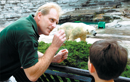 | Sharing the secrets of the Zoo Bryan McKenna, a docent at the Buffalo Zoo, interests visitors by quizzing them about animals, then giving them a chance to guess the answers. McKenna also contributes to frog research and can recognize faint frog calls. BUFFALO NEWS Monday, September 6, 2010 Section: News Page: B1 On a hot day the week before school started, a polar bear swam nonchalantly on his back in the pool and children with a gray-haired lady stopped to laugh and guess at Bryan McKenna's questions about the secrets of the Buffalo Zoo. Who's got the longest tail? What would a tiger look like if you shaved its fur? Who's the boss of the hyenas? Answers: The giraffe. Tiger skin has stripes, too. Female hyenas won't let the males sit on the big heated rock in winter. The bear paused in the water and rested his head on the ledge, as if listening, too. McKenna, a docent who has taken every training class, went on. "He could smell a hot dog cooking from Niagara Falls," he said of the bear's power to detect scents for miles in the Arctic. McKenna has a habit of sharing what he knows with zoo visitors he meets even when he's not scheduled to stand at a popular spot and talk. On this day, he had come to give a tour to a young family friend. Breanna Gerner, 12, knew his routine. As McKenna went on -- Do you think bears are lonely by themselves? They're happier that way. They don't like sharing food. -- she began to peer into his pockets. She wanted him to show the bear claws. In the four years since he retired from a 30-year career driving and unloading trucks for as many as 60 hours a week, McKenna went from being a quiet guy to surprising his wife and friends by talking all the time about the creatures he'd been wanting to know more about since he was a boy living nearby and walking to see Samson, the zoo's old gorilla. First laid out as a deer sanctuary in 1875 by park designer Frederick Law Olmsted, the zoo is now surrounded by neighborhood houses and streets, where a person can hear a lion's roar from bed and think life here is so unusual. Giraffes lope just beyond the fence along Parkside Avenue. Peacocks wander into yards. When neighbors call, unfazed zoo officials tell them not to worry. The birds, McKenna said, know how to get home. Stories of the 1,200 animals living behind glass and fences in the pools and rocky habitats on the zoo's 23 acres do get out through the people -- 69 full-time staff, 120 docent volunteers, 460,000 visitors last year -- who take the time to get to know the lesser-known quirks. Hum and curious sea lions swim to the window. Sometimes the other snow leopard cub hides in the rocks. McKenna listens for the deep howls of the "loudest land-mammal" -- howler monkeys -- and reveals that vampire bats in the rain forest exhibit's cave drink blood supplied by a farmer's cow. Kids who come back year after year have learned his facts, so he keeps collecting, studying online, watching Animal Planet on TV and talking to zookeepers and docents. "I know some really cool stuff about reindeers that you probably don't know," he told Breanna as they walked. Females are the ones that keep their antlers in winter. "All Santa's reindeer are girls," he said. "Or, Santa Claus is magic." Since McKenna, now 52, first called to offer to clean up after the elephants and wash windows, the zoo has gradually changed his life. Cleaning was union work, he learned. To be a volunteer, he would have to take classes. After 13 weeks of six-hour lessons on Saturdays, he was fascinated to see the zoo's private places: the TV that plays Sesame Street for the gorillas, the vet clinic by the giraffe house, a close behind-the-exhibit look at how big the tigers really are. He soon took animal handling and other courses so he could take pythons, turtles and blue-tongued skink lizards to nursing homes, schools and children's hospital wards. Even though ferrets leave behind a stinky, musty smell on the hands, Dakota and Cupid delight people so easily with their willingness to be held that he now considers them some of the most important animals. Last winter when zoo docent assignments dropped along with visitors, McKenna also got a new appreciation for amphibians. Restless without a full schedule, he considered finding a regular job until he was offered a spot in a special training class. To learn how to collect frogs and find if they had a similar kind of amphibian chytrid fungus that was killing the golden frogs in Panama, he learned to distinguish local frog calls by listening to recordings he kept in his laptop. A visiting scientist marveled that McKenna could hear the scarce "chorus" frogs call -- like a finger running across the top of a comb -- near his North Tonawanda backyard along the Erie Canal. Then when he and a team of two students went to a swamp thick with poison ivy and hatching mosquitoes, they found a toad with the fungus. While it's too soon to tell how dangerous it is locally, McKenna worries about disappearing habitats and disease that lead to extinction. He wishes he could do more. "I know there's nothing I can do to save the planet," he said, "but the zoo can." Over by the bear pit, McKenna reached into his pocket. He always brings his "zoo things." He thinks they help get people curious, and public interest should help keep the animals safe. When he talks, he may pull out a lipstick case with the rattlesnake rattle. Or, the 18-inch string as long as the tongue the giraffe uses to clean its ears. The family this day examined the sharp plastic claw that shows how a bear climbs ice. The family thanked him and left. "We have learned so much," they said. McKenna was ready to go, too. He knew Breanna would love seeing the Australian parrots' bristled tongues that look like paintbrushes. Just before they hurried to the other side of the zoo, the polar bear stuck his nose up in the air and slipped back into the water. |